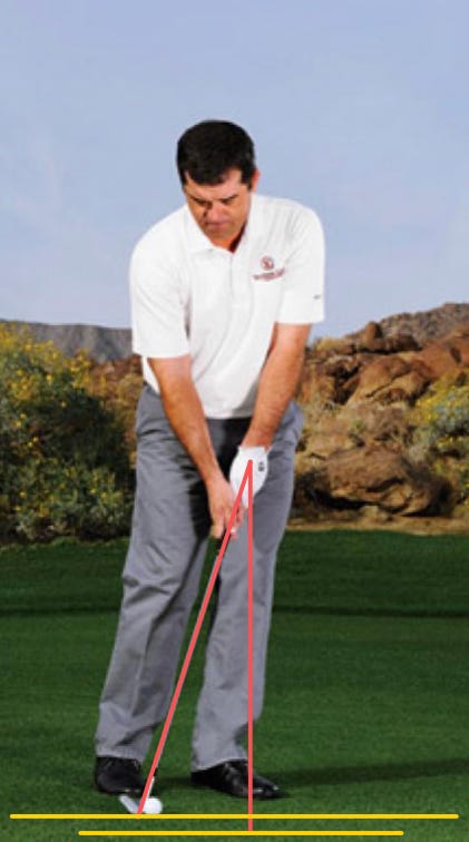 In the picture above, if you take the length of the club and decide to put it in a vertical position, notice how the end point would be roughly two inches below the ground. You’d have to manipulate the arc of the hands coming into impact in order to not take a fat chunk of turf. It’s way easier to just choke up on the club and keep the shaft fairly vertical (small amount of lean is fine). This way, all you have to do is make a simple, natural motion and the impact position will match address.